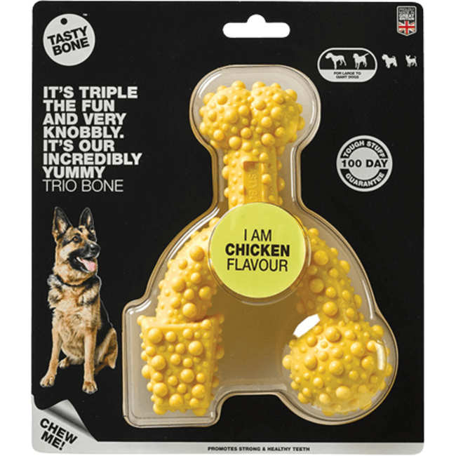 Het is drie keer zo leuk en lekker geribbeld. Dit is de ongelooflijk lekkere Trio Bone. Net als alle nylon kauwsnacks is dit TastyBone-product getest op de meest fanatieke kauwers.